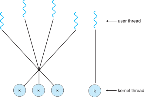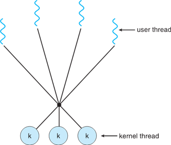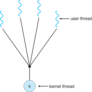 - 다대일 모델은 많은 사용자 수준 스레드를 하나의 커널 스레드로 사상(mapping)함.